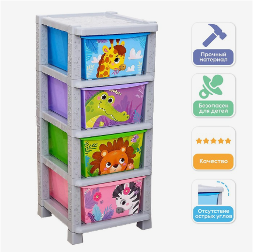 Практичный комод поможет правильно организовать хранение вещей. Изделие имеет жёсткую конструкцию. Отсутствие острых углов делает его безопасным для ребёнка. Каркас и контейнеры изготовлены из экологически чистого материала, поэтому не содержат вредных веществ.