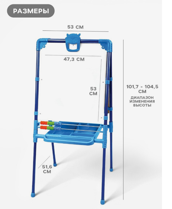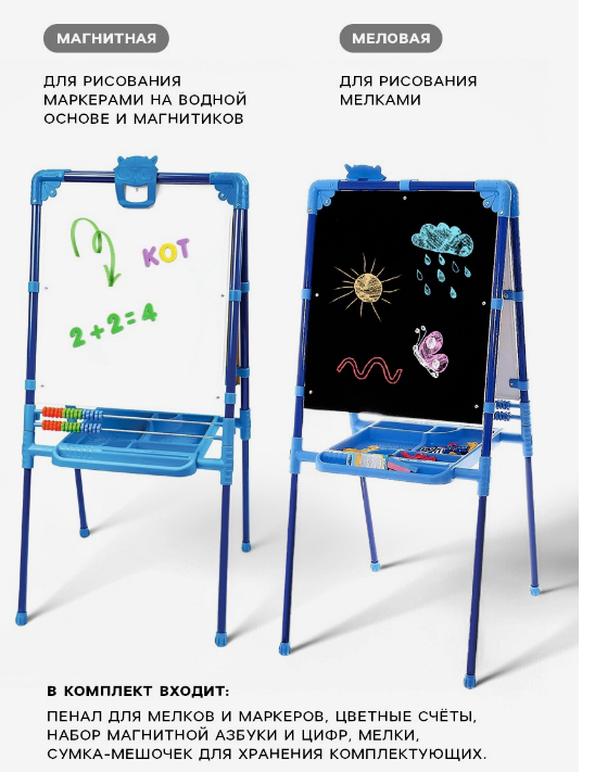 Двухсторонний мольберт с магнитной азбукой предназначен для детей от 1,5 лет. В его комплект входят доска для рисования маркером или мелом, вместительный пластиковый пенал для художественных инструментов, магнитный набор из русской азбуки, цифр, знаков препинания.